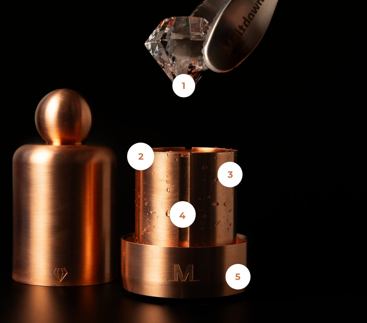 Meltdown Mogul ice presses are meticulously handcrafted in small batches and milled from three solid pieces of copper, with a design that is U.S. patented.
